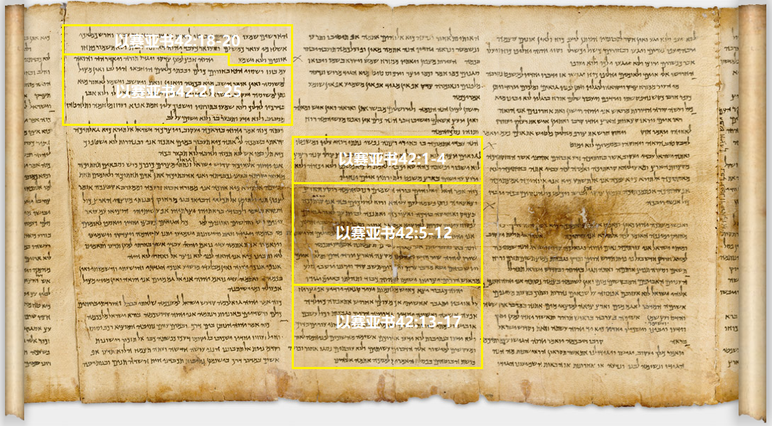 - 本章对比神理想的仆人和又聋又瞎的仆人,根据死海古卷《以赛亚书》羊皮卷(The Great Isaiah Scroll,1QIsaa)的分段,可以分为五个部分: